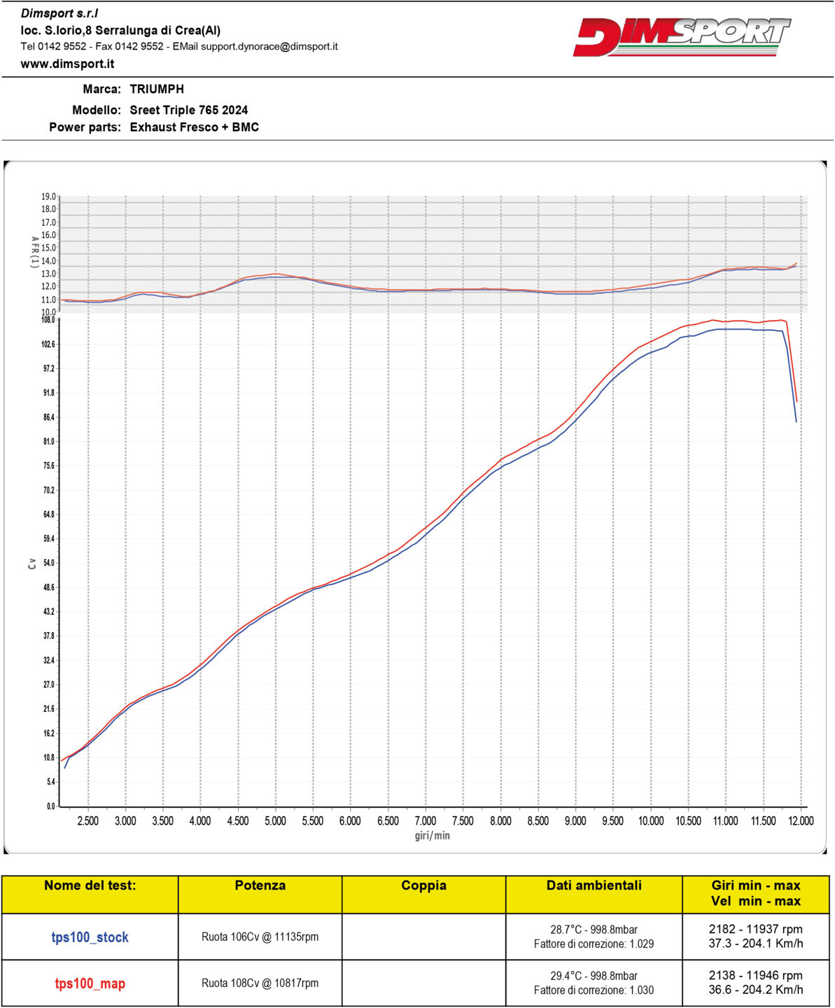 Rapid Bike Smart installation on this motorcycle grants outstanding results, such as a significant improvement noticeable already at lower revs: power delivery becomes much smoother, with great benefits for overall perfomance. The Dyno graphs below show 2 hp increase already at 15% throttle opening, with a progressive horsepower gain following the accelerator openings.