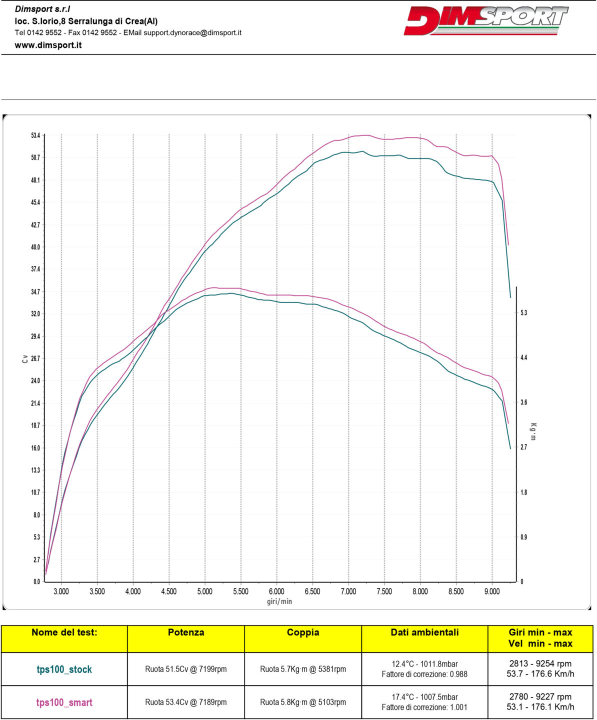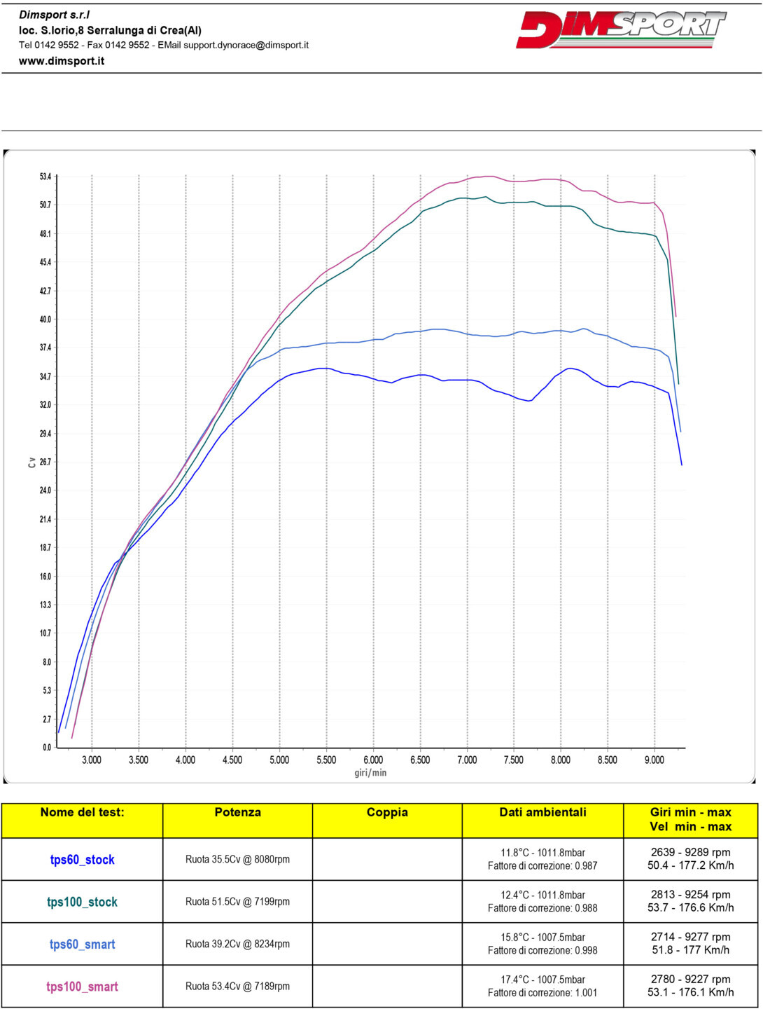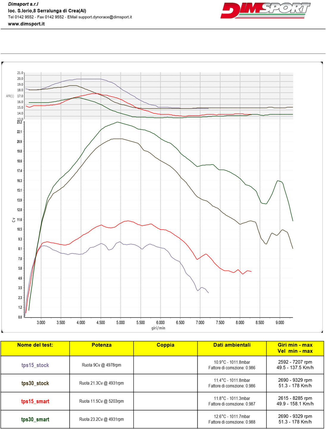 Come evidenziato nei grafici sottostanti, l’apertura dell’acceleratore si traduce in un sensibile incremento sia di coppia che di potenza, con prestazioni decisamente superiori rispetto alla configurazione originale della moto.