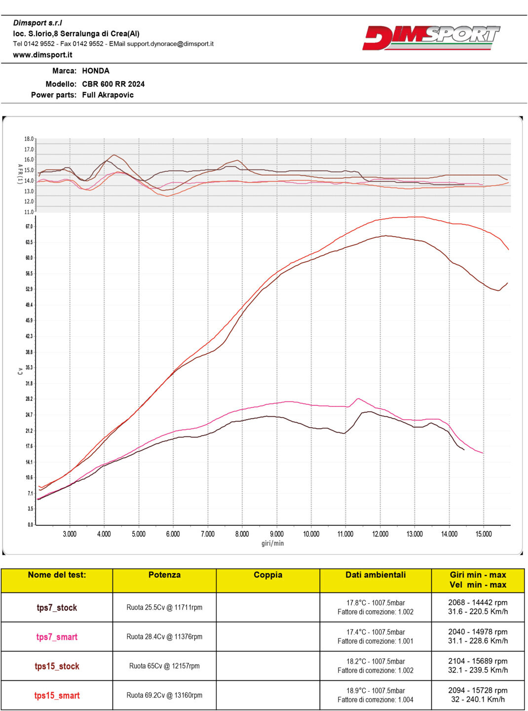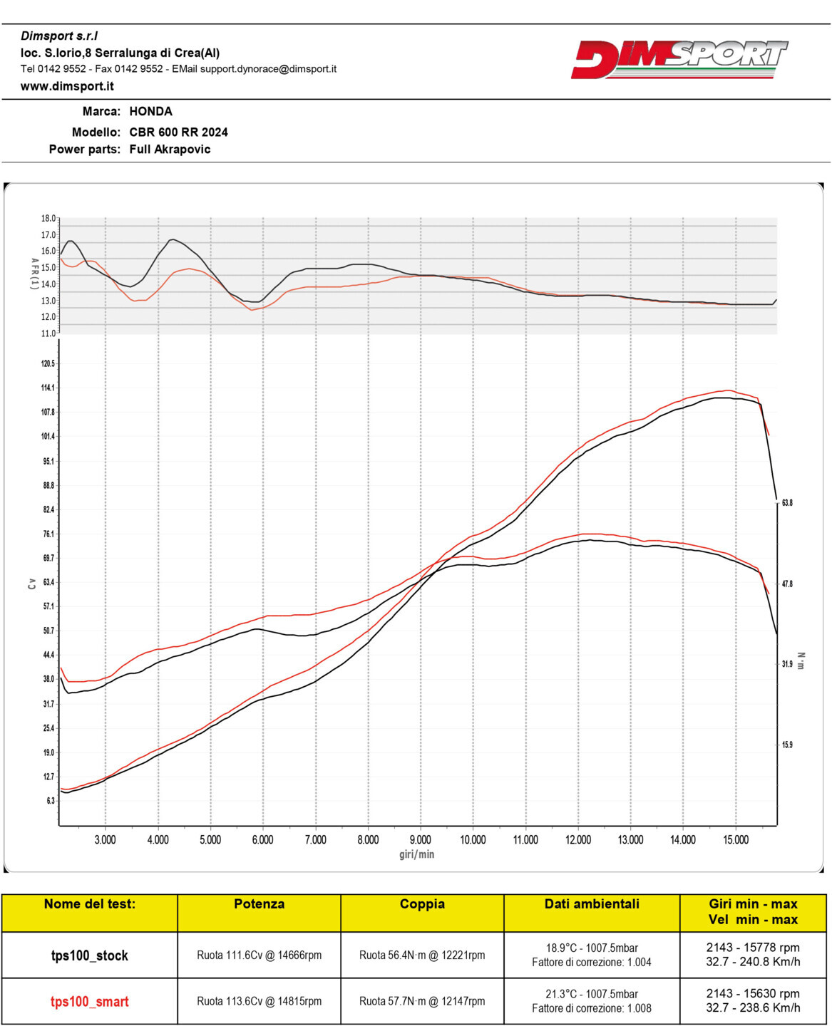 L'installazione del modulo aggiuntivo Rapid Bike Smart ha permesso al motore della CBR 600 RR di dare il meglio di sé; come si può notare dai grafici sottostanti infatti già al 15% della potenza possiamo vedere un netto miglioramento nell’erogazione, eliminando quasi del tutto quei buchi che il motore presenta di serie.