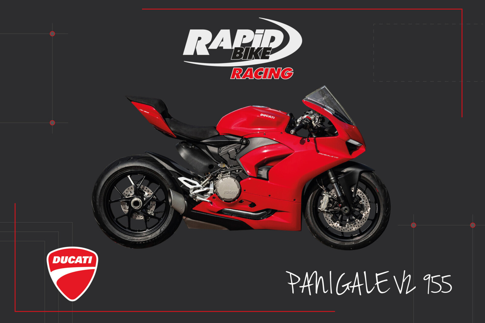 Il bicilindrico Superquadro 955 cm3 della Panigale V2 è conforme alla normativa Euro5, questa moto muscolosa ma compatta sviluppa 155 cv e, a 9000 giri, 104 Nm di coppia. Su questo gioiellino si sono concentrati i tecnici Rapid Bike rendendo la guida su strada più fluida e sempre più divertente quella su pista.