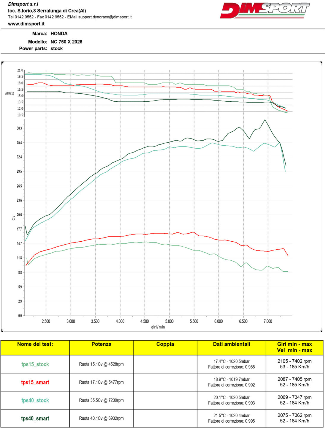 Il grafico evidenzia in modo chiaro il comportamento della Honda NC750X prima e dopo l’installazione della Rapid Bike Smart2, mettendo a confronto le curve di potenza e coppia lungo tutto l’arco di utilizzo.