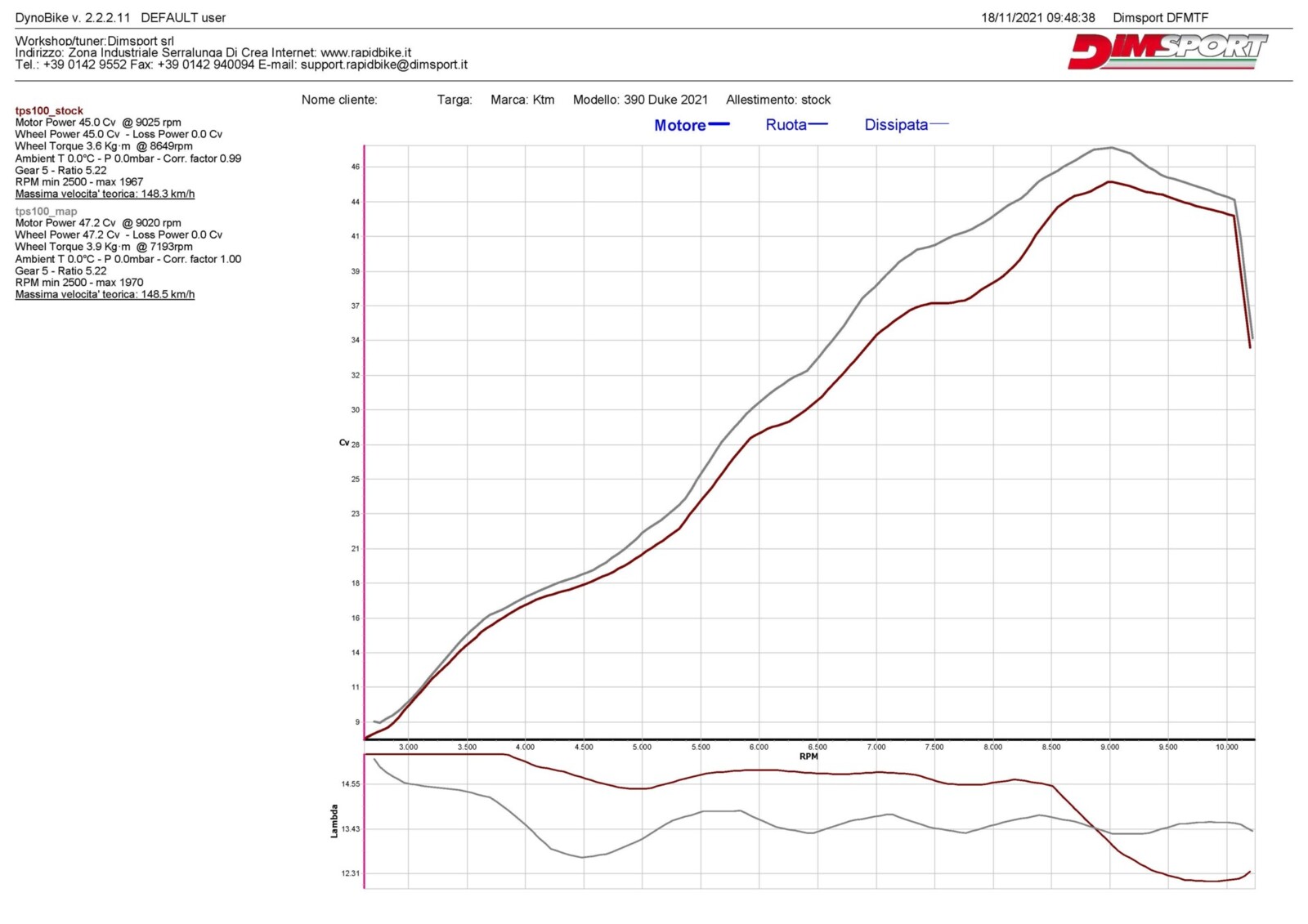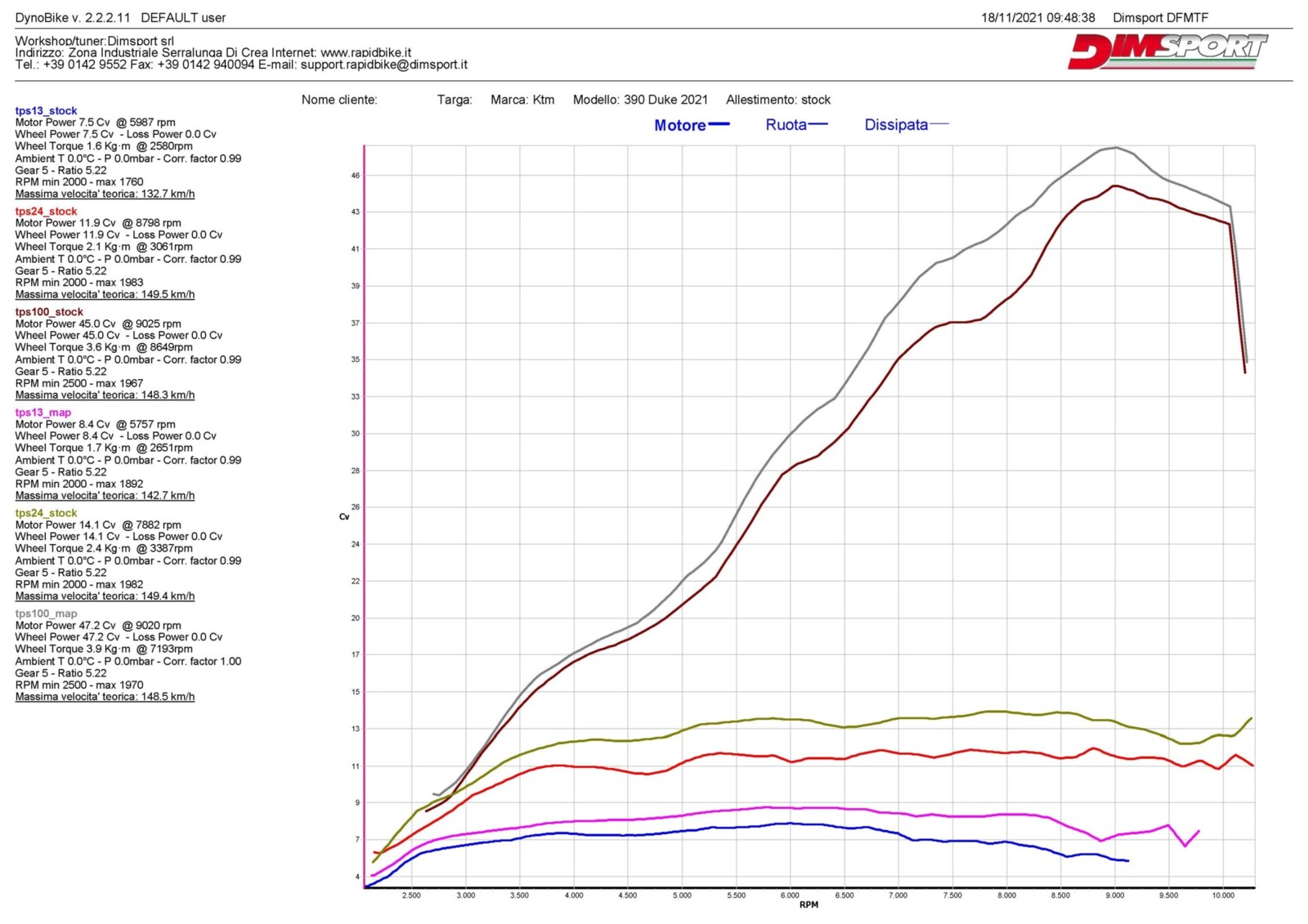 I grafici relativi allo sviluppo danno risalto ad un incremento fino a 4cv sulla curva di potenza con la moto in configurazione stock a partire dai 7000, fino a 9000rpm con gas a martello. Uno strabiliante risultato per il monocilindrico 390cc che grazie al ridotto rapporto peso-potenza spinge la Duke fino alle soglie della categoria superiore.