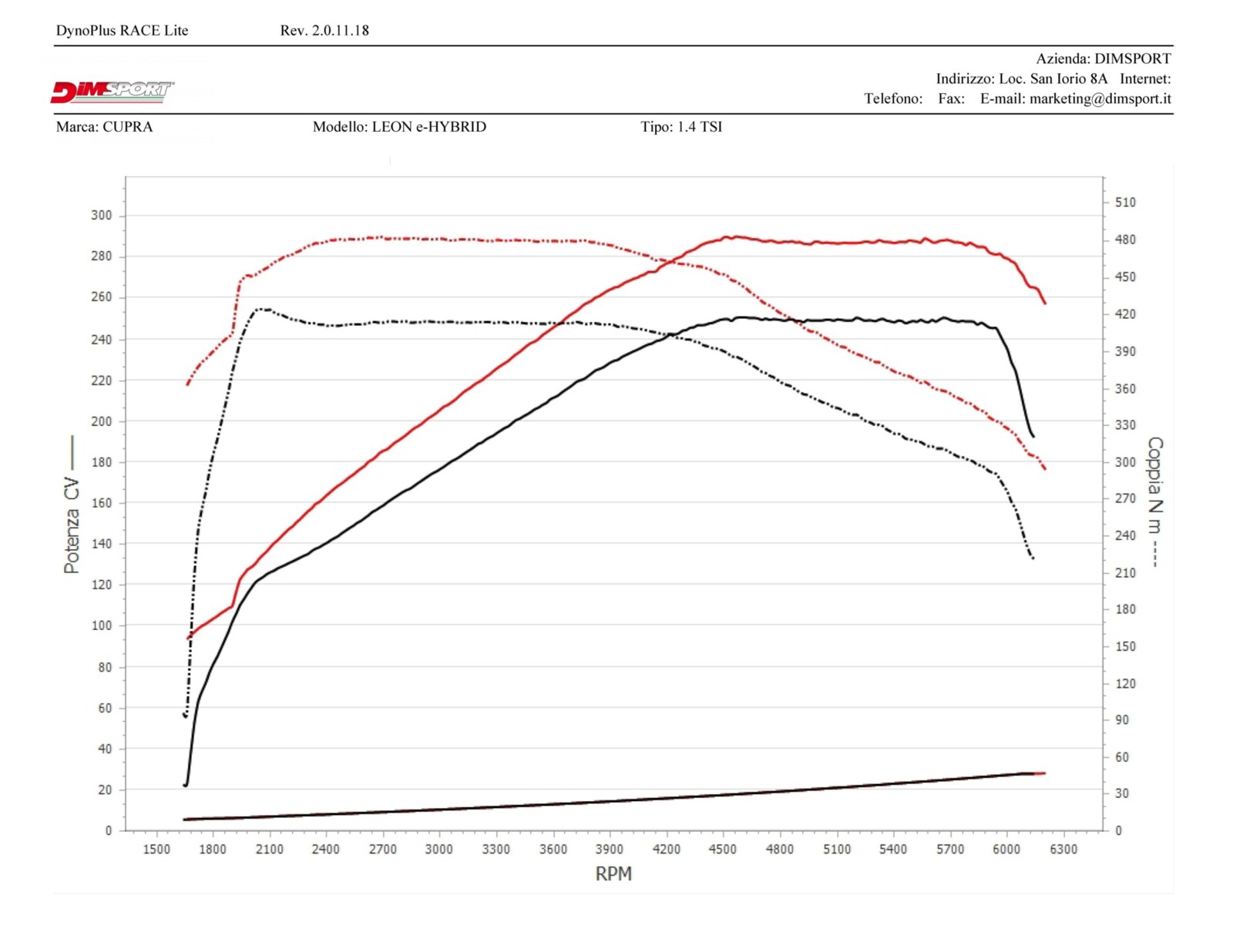 I risultati dello sviluppo sono stati particolarmente soddifacenti. La combinazione dei due motori rendono la Leon e-Hybrid molto scattante già in configurazione stock (245 cv e 400 Nm); ma il piccolo 1.4 ha ancora molto margine di incremento: la curva di potenza sale fino a quota 290 cv e 480 Nm, con un'erogazione tipicamente "hybrid", con un picco di coppia massima a soli 2500 rpm, mantenuta costante fino a soglia 4000 rpm. In questa fase Rapid TPM tira fuori tutto il potenziale del motore di casa Volkswagen erogando la massima potenza disponibile.