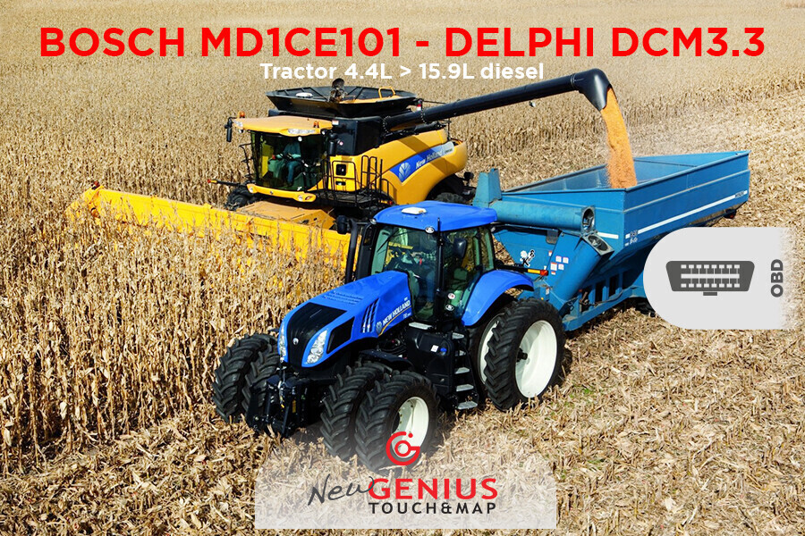 Gli ultimi sviluppi di Dimsport ti offrono la possibilità di intervenire nel modo più facile e veloce tramite la presa OBDII sulle centraline BOSCH MD1CE101 e DELPHI DCM3.3 TIER III/DCM3.3LS/DCM3.3+ installate su trattori, mietitrebbie e veicoli da lavoro fra i più diffusi sul mercato: rimappa con New Genius grazie ai protocolli seriali flash_0813, flash_0821, flash_0825.