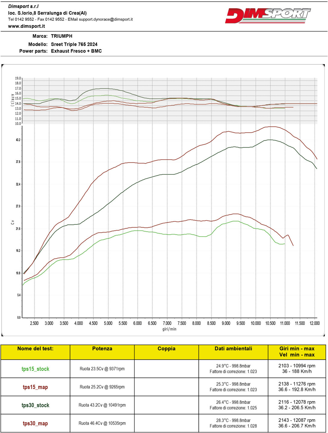 L'installazione del modulo aggiuntivo Rapid Bike Smart su questa moto ha prodotto risultati davvero eccellenti. Già ai bassi regimi si nota un miglioramento significativo: l'erogazione diventa molto più lineare e le prestazioni complessive risultano superiori. Come mostrano i grafici sottostanti, si registra un aumento di 2 CV già con un'apertura del gas al 15%, con un incremento progressivo dei cavalli man mano che cresce la potenza erogata, grazie all'intervento del modulo.