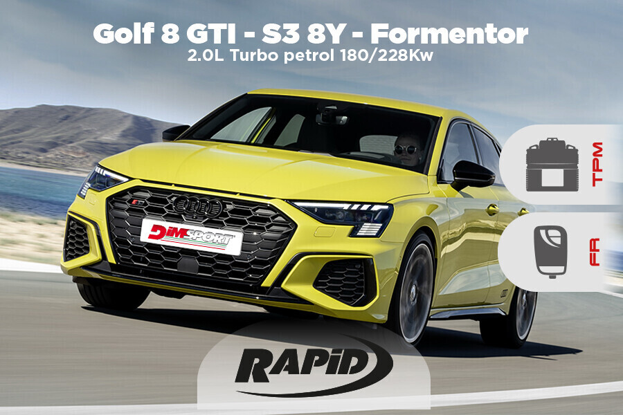 Auto che hanno fatto la storia, e che continueranno a stupire. Auto che oggi offrono una farcitura di tecnologia e design all'avanguardia. Golf 8 GTI, Cupra Formentor e Audi S3 8Y, sono vetture ambite da giovani e meno giovani, grazie soprattutto ai motori 2.0L turbo benzina che, già in configurazione stock, offrono ottime prestazioni. Per loro Dimsport propone la combinazione Rapid TPM (modulo per l'incremento della prestazione del motore) e Rapid FR (modulo per la personalizzazione dello stile di guida tramite modifica della sensibilità del pedale acceleratore).